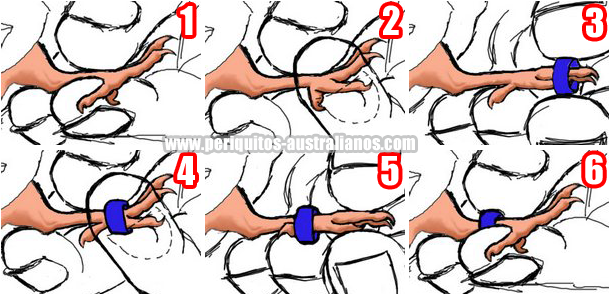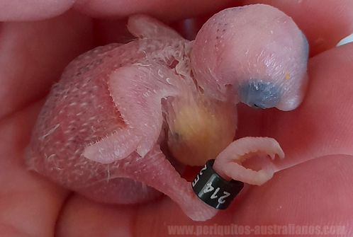 Si el nacimiento es por la mañana, y por la tarde sigue con el buche vacío, lo más probable es que no supere la noche; podemos cambiarlo a un nido con polluelos de edad simlar, o uno dónde estén a punto de nacer. Si tenemos suerte, la madre adoptiva lo alimentará enseguida; si no, se le puede dar una toma de papilla cómo se explica aquí. Aumenta las posibilidades de supervivencia y da a la madre la oportunidad de arrancar si le ha costado reaccionar. Si no llega a hacerlo, seguimos optando por introducirlo en otro nido o alimentarlo a mano. Durante este tiempo es ella la que se encarga exclusivamente de preparar el alimento. El macho puede entrar al nido a regurgitarle alimento para que lo distribuya entre sí misma y los pequeños. Es un proceso que ayuda a los polluelos a enriquecer la microbiota de su sistema digestivo, cosa que no ocurre cuando son alimentados a mano. A medida que avanza su primera semana, entre los 5 y los 7 días es el momento de anillar aprovechando que ya tiene suficiente tamaño y que sus dedos aún son cortos, si esperamos más, sus dedos puede que se alarguen mucho y cuesta más introducir la anilla hasta el tobillo. Las anillas usadas para los peris son de 4 mm (4.0).