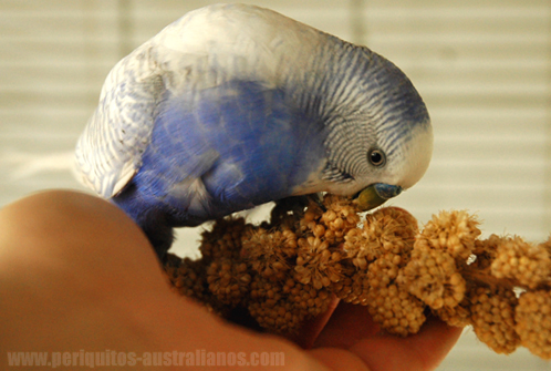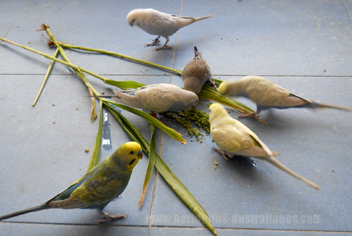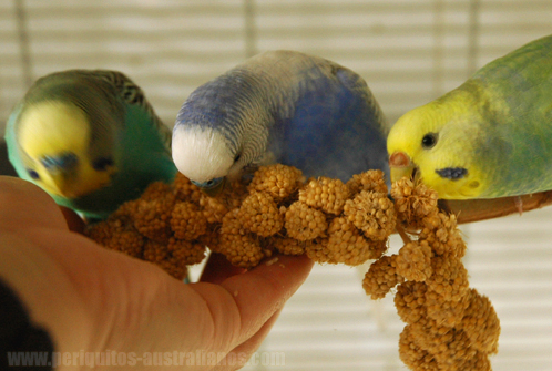 Existen en el mercado germinadores para prepararlas con más seguridad (evitando encharcamientos prolongados) en el caso de que no seamos capaces de fabricarlo nosotros. También un producto al que denominan "perla mórbida" con cualidades similares a los germinados, que a diferencia de los naturales, se puede almacenar bajo las condiciones dle fabricante. Espigas cultivadas: Plantando las semillas de la mezcla podemos conseguir espigas que harán las delicias de nuestros peris. Ellos disfrutarán cubriendo su instinto de desgranar y tomarán vitaminas como la A, que suele ser carencial en una dieta exclusiva de sem,illas secas. Si son más maduras, serán sabrosas semillas con todas sus propiedades, más frescas imposible (y no dejarán de picotear los tallos). Para conseguir más espigas en una sóla temporada, plantaremos los mijos (blanco, amarillo o rojo), que son capaces de generar varias cosechas por temporada con espigas cargadas de pequeñas semillas para las que están adaptados de forma natural. También se les pueden frecer los brotes tiernos que puedan crecer de más limpiando la tierra.