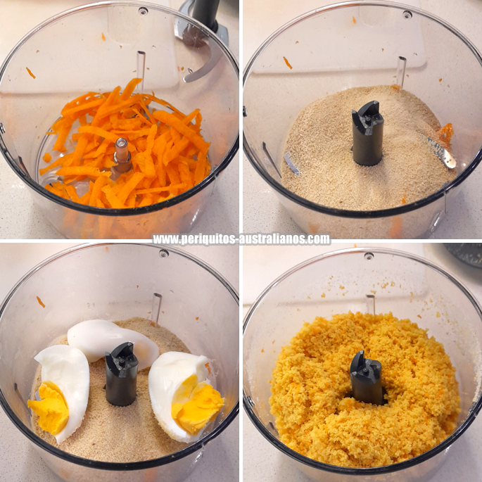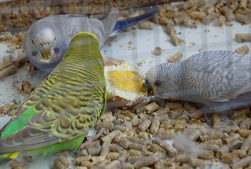 Pasta de cría: puede hacerse de forma casera y la base es el huevo cocido. Se puede mezclar con pan rallado, cereales para bebés o con salvado de trigo/avena pasado por la picadora (según algunas fuentes) para conseguir una textura más granulada, menos húmeda y menos apelmazada. Personalmente prefiero usar el pan rallado como estructurante, usé salvado en algunas ocasiones probando cantidades y mezclas, y el resultado no fue muy satisfactorio en general, y los aportes de la avena los pueden tomar directamente de la semilla muy gustosamente. También se le pueden agregar otros ingredientes que se puedan picar y mezclar, desde vitaminas preparadas en polvo a vegetales comestibles. Las recetas se elaboran a partir del conocimiento de qué cosas son comestibles, y es una forma más de nutrir a nuestros periquitos evitando la monotonía.