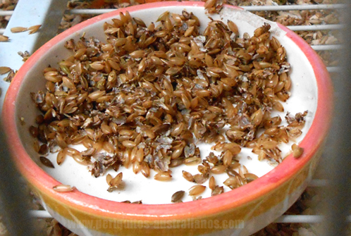 Nosotros debemos elaborarlos con cuidado para evitar que hongos y mohos contaminen el preparado. Se sumerjen las semillas en agua con un poco de vinagre que acidifique el medio durante 6-8 horas. Hay que evitar que el montón sea muy espeso, germinan mejor si están bien extendidas. Tras esto, se enjuagan bien y se mantienen húmedos y templados en un recipiente evitando el encharcamiento. Puede ser cualquier tipo de recipiente con la base perforada para que escurra el exceso de agua, y bajo el cual pueda existir una capa de aire que oxigene desde abajo. Se hacen enjuagues abundantes a lo largo del día (por ejemplo: mañana, mediodía y noche) para evitar la proliferación de microorganismos. Cada vez que enjuaguemos, podemos inspeccionar en qué estado se encuentran, y en cuanto comiencen a asomar las puntas blancas de la primera raíz, están listos para ser servidos. No hay que esperar a que comiencen a brotar, pues la plántula consume los nutrientes que queremos darles a los periquitos. Si tardan demasiado en germinar puede deberse a que las semillas no son muy frescas, están dañadas, o las condiciones que les brindamoss para germinar no han sido las adecuadas. Ante cualquier duda sobre su salubridad, es mejor descartarlas y comenzar el proceso de nuevo cambiando alguno de los factores que han podido fallar. Las semillas para los germinados pueden ser las mismas que las de la mixtura (evitando la linaza si la tienes en tu mezcla por el mucus que produce), y las más cómodas para germinar y servir son las más voluminosas. En este caso, para los peris se puede usar tanto avena como trigo (aunque el trigo no esté en la mixtura). Son semillas relativamente grandes, muy fáciles de germinar y de conseguir.