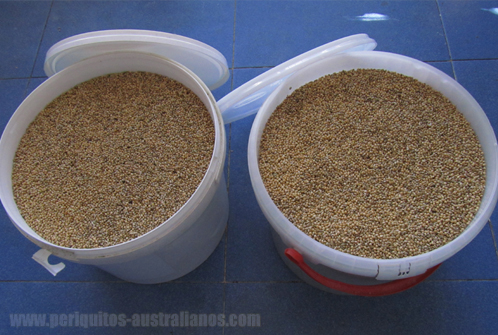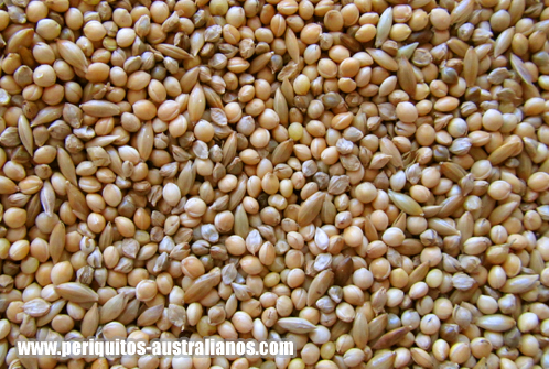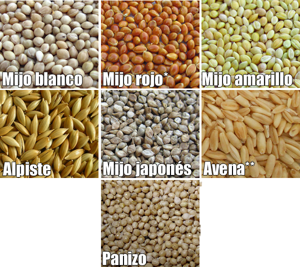 Siendo granívoros, los periquitos están especializados en aprovechar al máximo la energía que las semillas les aportan, y en especial, la grasa. De forma natural en su hábitat, la grasa es muy escasa, con lo que una buena capacidad de retención de la poca que se consigue será imprescindible para un equilibrio energétco y para asegurar la supervivencia del individuo, que, a diferencia de los domésticos, realiza un enorme despliegue de actividad física. Esto en cautividad es más un problema que una virtud, con lo que si podemos evitar semillas oleoginosas, lo mejor será eliminarlas completamente de la dieta. SEMILLAS BASE -Mijo blanco y rojo, mijo común (Panicum miliaceum) : originario de Asia y África (libre de gluten), el mijo común es una de las semillas más utilizadas en todas las mezclas para aves granívoras. Las diferentes variedades (subespecies) de color diversifican igualmente sus propiedades nutricionales, siendo el mijo rojo el que tiene un mayor aporte de grasa con respecto al otro. El mijo blanco (P. miliaceum subsp. miliaceum) es el más bajo en contenido graso, por ello se utiliza junto con el alpiste en dietas de adelgazamiento para periquitos obesos. Es preferible que haya mijo blanco en la mezcla en lugar del mijo rojo. -Mijo amarillo, arrocillo (Echinocloa colona): originaria de Asia tropical y África. Es una semilla pequeña y lanceolada, que puede ser de tonos cremas, tostados e incluso amarillo. Forma parte de las mezclas al igual que el mijo común. El contenido total de mijos no debería ser inferior al 50% (aproximado), siendo volumínicamente el tipo de semilla que formará parte de la base de la dieta. -Alpiste (Phalaris canariensis): Semilla fácil de pelar que se usa para mezclar con la mixtura habitual de mijos. Es proporcionalmente más rica en proteínas que el mijo amarillo, con lo que son un agregado deseable en la mezcla, pudiendo ocupar hasta el 50% restante con respecto a los mijos blanco y amarillo. Se utiliza también para los pollos recién emancipados, su forma alargada y cáscara suave facilita la labor de separar la cascarilla de la semilla, de manera que en el momento en el que deben aprender a comer por su cuenta, son unos granos adecuados para que practiquen los primeros días y no pasen hambre. No debe ser la única semilla que coman, siempre mezclado. -Mijo japonés (Echinochloa frumentacea, Echinochloa esculenta): Ambas especies se conocen como mijo japonés. Sólo la E. frumentacea tiene como nombre común mijo sawa (entre otros) y supuestamente es el antecesor salvaje del mijo amarillo (E. colona). Según "diamantemandarin.es", contiene cantidades interesantes aminoácidos esenciales como la lisina, tirosina, metionina y la cistina, pero no especifica cual de los dos es, mezclando las especies E. crus-galli y E. colona. La info fue copiada en un "blogger" diamantesmandarinesbcn.blogspot.com.es (fuera de línea 10/11/2018) desde la página de un criador de diamantes mandarines llamado Vicente Ibáñez que antiguamente tenía una página web muy completa. -Panizo (Setaria italica): es una semilla que se suele vender en espiga, aunque también se encuentra a la venta desgranada, es algo irresistible para los periquitos. Es blanda, digestiva y calórica, con lo que al igual que la avena, con moderación. Se puede usar para que los pollos en el nido comiencen a picar por su cuenta. He observado como le meten el pico a todo lo que encuentran en el suelo del nido, que en mi caso además de algunas heces y plumas, es el zuro de maíz. Las espigas de panizo que puse suelen merendárselas a gusto los padres, pero también he visto a los pollos desmenuzarlas. No suelo tener problemas de pollos que no coman una vez fuera del nido (a la fuerza o por su propia iniciativa) pero el panizo suele ayudar tanto antes (lo han probado y saben lo que es, no sólo por el institnto de irse a las semillas) como después para incentivarlos y que tengan además calorías extras para superar rápidamente la fase de "hambruna" normal cuando se emancipan. -Avena (Avena sativa): Semilla alargada de color marrón tostado. Es recomendable añadir la avena en periodos de cría, es digestiva y favorece la activación del metabolismo. En invierno también es recomendable por requerir menos esfuerzo para su digestión. Rica en antioxidantes (vitamina E), contiene fibras solubles (betaglucanos), y es una fuente excelente de potasio. *El mijo rojo sólo tiene la proporción alta de grasa como atractivo, puede añadirse cuando los requerimientos de energía son altos, como el frío del invierno o las primeras fases de una nidada, por lo demás, es preferible evitarlo por la tendencia natural de los periquitos a engordar, especialmente habiendo semillas más interesantes como la avena, más nutritiva. **La avena se puede añadir en la mixtura habitual todo el año, pero en pequeñas cantidades por su valor energético, o en un comedero a parte para controlar mejor la cantidad y la frecuencia. A pesar de que nutritivamente es interesante y a los periquitos suele gustarles mucho, el abuso de la avena en épocas de poco esfuerzo puede llevar al engorde de nuestras avecillas, en especial de las hembras, que de por sí tienden a engordar por ser generalmente menos activas que los machos. Es interesante agregar más avena cuando llega el frío del invierno si nuestros periquitos NO VIVEN EN EL INTERIOR DE NUESTRA CASA. También es una excelente semilla muy nutritiva en la cría. La mezcla debería verse más o menos así, de un tono crema, sin el colorido y vistoso mijo rojo, que suele darle una estética más atractiva pero no necesariamente más saludable.