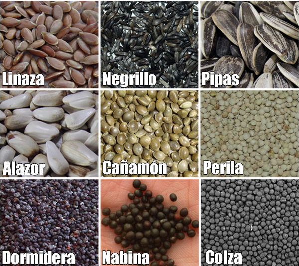 -Linaza (Linum usitatissimum): tradicionalmente se considera que aporta beneficios para el plumaje y bastante energía, pues se trata de una semilla oleoginosa. Al igual que todas las semillas grasas, hay una tendencia a agregarla o a aumetarla en épocas de cría. En la versión precedente recomendaba su uso, retirándola si se contaba con mijo japonés. Actualmente la descarto completamente. -Negrillo, niger, abisin (Guizotia abyssinica): es una semilla pequeña y alargada de color negro que suele utilizarse en mezclas comerciales de pastas de cría. Las pastas de cría originalmente estaban pensadas y fabricadas para los frigílidos (jilgueros), que en la naturaleza sí comen de este tipo de semillas, de manera que imitaba de forma artificial la dieta enriquecida e períodos de cría. Por contagio estas pastas de cría fueron utilizadas en la cría de otras aves, agregando así a la dieta el negrillo, que precisamente por su contenido graso, suele gustarles. Equivocadamente se les suministra como complemento energético. A no ser que el frío o las condiciones climáticas sean relativamente duras, no existen motivos nutricionales para ofrecérsela a los periquitos existiendo otras opciones que no resultan perjudiciales. -Semillas de girasol (Helianthus annuus): cada vez forman menos parte de las mezclas habituales. Hay 3 variedades: blancas, rayadas y negras. Si los periquitos las descubren, les gustarán, pero no las suministraremos a libre disposición, mejor como premios puntuales o un poco época de cría, pues tienden a engordar por lo grasas que son. Tienen un elevado contenido en albúmina, vitamina E (utilizado para encelar a los periquitos), B1, B2, niacina, hierro, fósforo, potasio, grasas vegetales y proteínas. -Alazor (Carthamus tinctorius): son similares a las pipas de girasol, pero algo más duras y con menor aporte nutricional. Si hay pipas de girasol, los periquitos no comerán del alazor. Son más indicadas para roedores que para aves. -Cañamón (Cannabis sativa): semilla redondeada y voluminosa, el tono es marrón verdoso estando todavía inmadura, cuando finaliza el proceso se vuelve pálida. Al igual que las semillas anteriores, no tiene ningún tipo de nutriente que se peuda considerar interesante que no puedan aportar las poaceas descritas inicialmente que sí son la base de la dieta. -Perila, albahaca japonesa (Perilla frutescens): más de uno la conocerá incluso como planta ornamental. Su semilla tiene un gran aporte proteico y graso, su origen está en el Himalaya y actualmente se comercializa como alimento para aves granívoras y resulta bastante común en países europeos como Francia y Suiza. Buscando información sobre la planta que origina estas semillas me encontré con que ahora parece ser que se llama Perilla frutescens y se la conoce en japón como Shiso. Es de la famila de las lamiáceas (menta, tomillo, romero...), del género Perilla (se pronuncia "perila"). En un versión anterior la he recomendado, y aunque no se considera una oleoginosa, sí contiene trazas grasas similares al negrillo (si no más altas), con lo que sigue el mismo tono que las demás: si no hay una demanda fuerte de energía, hay que evitar estas semillas. Al igual que ocurrió con el mijo japonés, ha desaparecido de la página de Vicente Ibáñez. -Semillas de amapola, dormidera (Papaver somniferum): Son pequeñas y con forma de riñón. Las hay de dos colores, azul o blanca, siendo la segunda la que parece que les gusta más en general. Tienen la propiedad de ayudar en la retención de líquidos, con lo que si algún periquito tiende a hacer heces muy líquidas, con estas semillas podemos ayudarlo a pasar mejor el problema sin que se deshidrate. Foto de http://lalagunilla.villena.org/. -Nabina (Brassica rapa): semilla de nabo de color oscuro (tonos marrones) bastante pequeña (1,5 mm aprox.). Un abuso de este tipo de semillas puede conllevar a problemas de aumento de volumen de tiroides y perjudicar la estimulación testicular. Suele utilizarse en canaricultura para que los canarios suavicen el canto. Definitivamente, no se la daría a mis pájaros. -Colza (Brassica napus): es tan pequeña como la nabina, pero en este caso el color es negro. Suele utilizarse para la fabricación de aceite de colza, también llamada colina. La planta suele utilizarse para forraje. Foto de http://www.biofuelseeds.org. |
