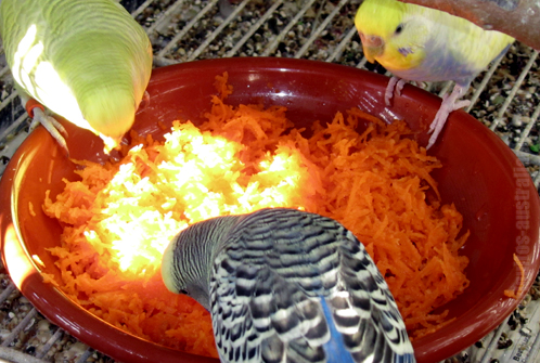 Ensalada: Podemos mezclar pedacitos de fruta y poner por el medio alguna hoja verde y/o semillas. Se lo ponemos en un comedero conocido o en un plato en el suelo (que no coincida bajo las perchas), y a medida