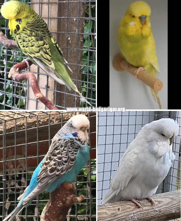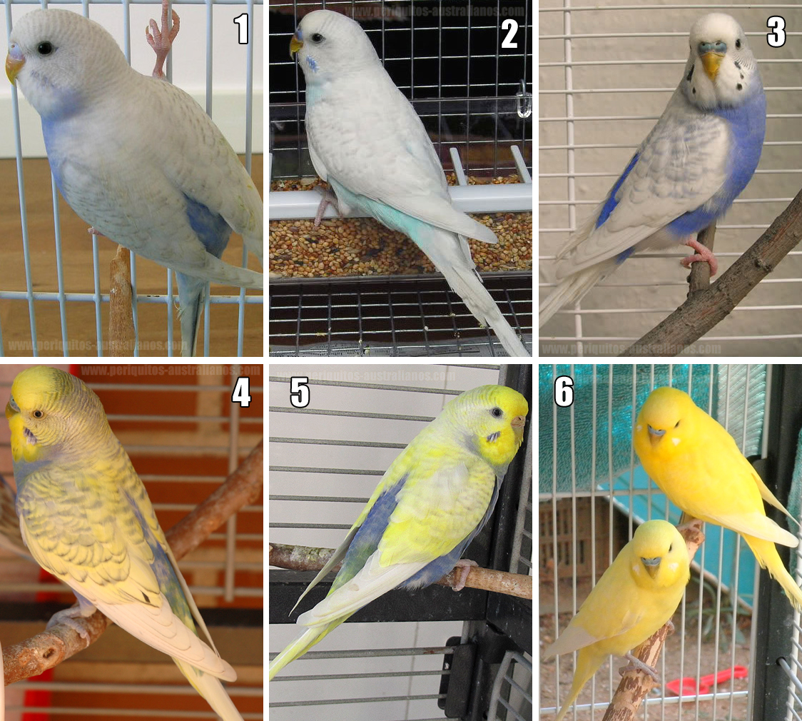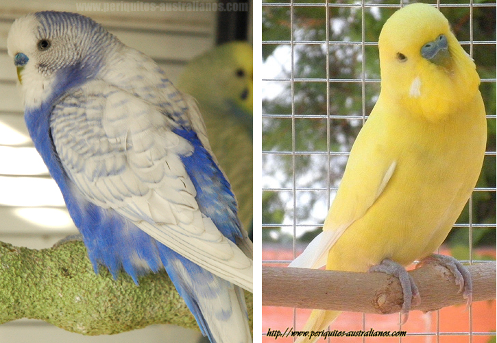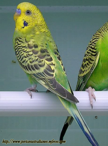 Esta mutación es semidominante, lo que significa que con un único alelo, un sólo factor (SF) tiene una manifestación, y con dos (doble factor, DF) "termina" de manifestarse. Cuando los perlados son dobles, se vuelven unicolores, ya sea amarillo en línea verde, o blanco en línea azul. Las gulares incluso se decoloran y quedan totalmente blancas. A pesar de ello, existe la posibilidad de que el perlado doble muestre una sufusión de color corporal a pedazos o casi completa, pero jamás de la intensidad normal, si no que con toque diluido. En la foto adjunta podemos observar este fenómeno, aunque ligero, presente en su pecho. No se deben confundir ni con los claros de ojos negros (BE, Blackeyes), ni con los lutinos. La mejor manera de distinguirlos a simple vista es el color del pico, que no será naranja. La cera en los machos será azul, y las patas no serán de color rosa, como ocurre con las otras dos mutaciones. Además de esto, a no ser que otra mutación esté manifiesta, tendrá iris diferenciado. Cuando la presencia del perlado es en forma simple, la estructura de las ondulaciones cambia radicalmente, desapareciendo todo cebreado intermedio, y quedando sólo un ribete, una línea de la última ondulación de cada pluma. Esto les confiere a las alas un aspecto escamado muy hermoso y muy característico. Estos ribetes, dependiendo de cada ejemplar, aparecerán más o menos gruesos (mejor o peor marcados). Incluso hay algunos perlados que mantienen una melanización bastante fuerte, y aparecen triángulos blancos enmarcados en las coberteras (un dibujo irregular muy poco deseable, que suele afear el aspecto del pájaro, aparentando desaliñado). También puede ocurrirles entre mudas que las líneas de sus ondulaciones escamadas se tornen del mismo color que el cuerpo, opalinizándose. Las remeras y las rectrices también se ven afectadas. En las remeras, hay una línea de las mismas características que en las coberteras, mientras que las rectrices o timoneras mayores, quedan completamente blancas. Si el perlado es de línea verde, serán avainilladas, pues quedarán restos de la psitacina, pigmento que la mutación no altera. Sus manchas gulares, en factor simple, también pueden verse afectadas y pueden cambiar con cada muda, quedando con color completo, parcialmente blancas, o completamente blancas. |