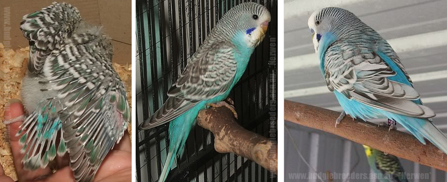 En Inglaterra y en Australia aparecieron casi al mismo tiempo, alrededor de 1991/92. Según una página Danesa que ya no existe como era (Undulatsiderne), los mutantes australianos ya no existirían hace años y se consideraban como si hubieran sido alguna cepa de perlado muy "amorfo" (si visitamos este foro demuestra otra cosa: "Budgie Breeders - Melanistic Spangles"). Tanto en inglaterra como en Australia, la manifestación mutante difiere del perlado en que el primer plumaje es casi común, a excepción de las caudales, que aparecen decoloradas (blancas o amarillas según la línea de color), pero con la caña central melanizada y algún ribete rebelde. Y sin embargo, a medida que van sucediendose mudas, o incluso tras la primera, acaban teniendo la misma apariencia que los periquitos mutados de Dinamarca. El criador Inglés (Jeff Atwood) quiso nombrar la variedad de su isla como "Perlado melánico" (Melanistic spangle). En Israel los bautizaron como "Cleartail". Yo, por comodidad, prefería usar el término israelí (per no ha cuajado xD). Tras esta breve aclaración: