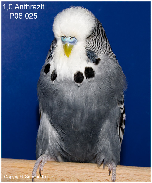 común de su variedad pero con un factor oscuro "de más", con el color de las rectrices y las gulares un poco más oscuras de lo habitual. Su comportamiento es idéntico al violeta y a los factores oscuros: Sin embargo, el mayor atractivo de los antracitas reside en su factor doble cuando se encuentra en línea azul, homocigóticos, pues confiere a los periquitos de línea azul un color casi negro en el cuerpo,