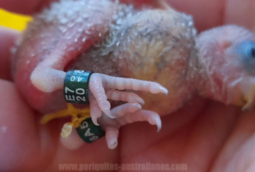 Si el nacimiento es por la mañana, y por la tarde sigue con el buche vacío, lo más probable es que no supere la noche; podemos cambiarlo a un nido con polluelos de edad simlar, o uno dónde estén a punto de nacer. Si tenemos suerte, la madre adoptiva lo alimentará enseguida; si no, se le puede dar una toma de papilla cómo se explica aquí. Aumenta las posibilidades de supervivencia y da a la madre la oportunidad de arrancar si le ha costado reaccionar. Si no llega a hacerlo, seguimos optando por introducirlo en otro nido o alimentarlo a mano. Durante este tiempo es ella la que se encarga exclusivamente de preparar el alimento. El macho puede entrar al nido a regurgitarle alimento para que lo distribuya entre sí misma y los pequeños. Es un proceso que ayuda a los polluelos a enriquecer la microbiota de su sistema digestivo, cosa que no ocurre cuando son alimentados a mano. A medida que avanza su primera semana, entre los 5 y los 7 días es el momento de anillar aprovechando que ya tiene suficiente tamaño y que sus dedos aún son cortos, si esperamos más, sus dedos puede que se alarguen mucho y cuesta más introducir la anilla hasta el tobillo. Las anillas usadas para los peris son de 4 mm (4.0).